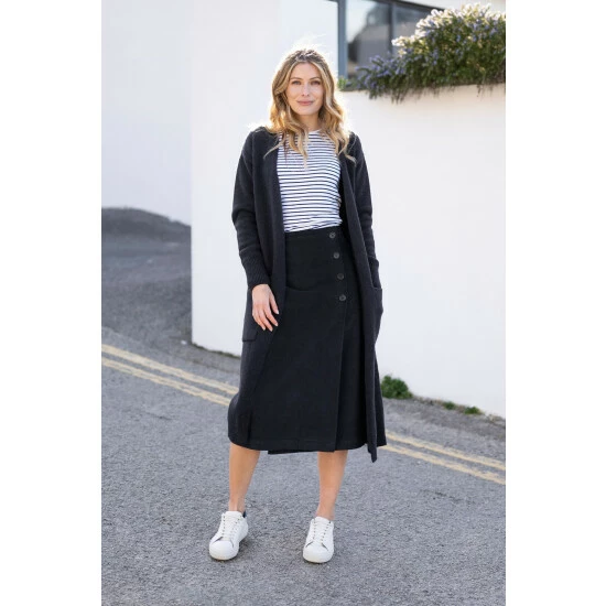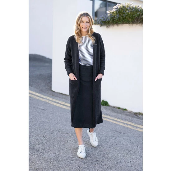 Adding a luxe element to your wardrobe this season, our longline cardigan couldn t be more effortless. We’ve crafted it in 100% lambswool with a supersoft feel and a felted finish you’ll love. Made from the same wool as our best-selling funnel-neck jumpers, spun in Italy by a supplier who holds all the essential compliances and accreditations demanded by eco-friendly production. Cut to a three-quarter length with edge-to-edge styling for a minimalist look, it’s detailed with patch pockets and ribbed trims. Pull it on for lazy lunch dates, pottering around in the garden or heading out on a chilly evening.